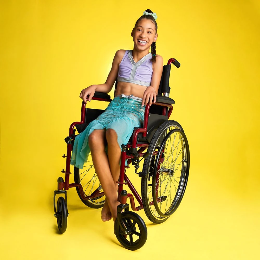 The water is so much more fun when you’re a mermaid. This three-piece Ariel adaptive swim set features a two-piece swimsuit and long mermaid skirt, all with self-stick fabric closures for ease of use. Inspired by Disney’s animated The Little Mermaid, the set shimmers with pretty details like an allover metallic print on the bottom and skirt, pretty silvery trim on the top and an organza fishtail hem on the skirt. Let the splashy fun begin.