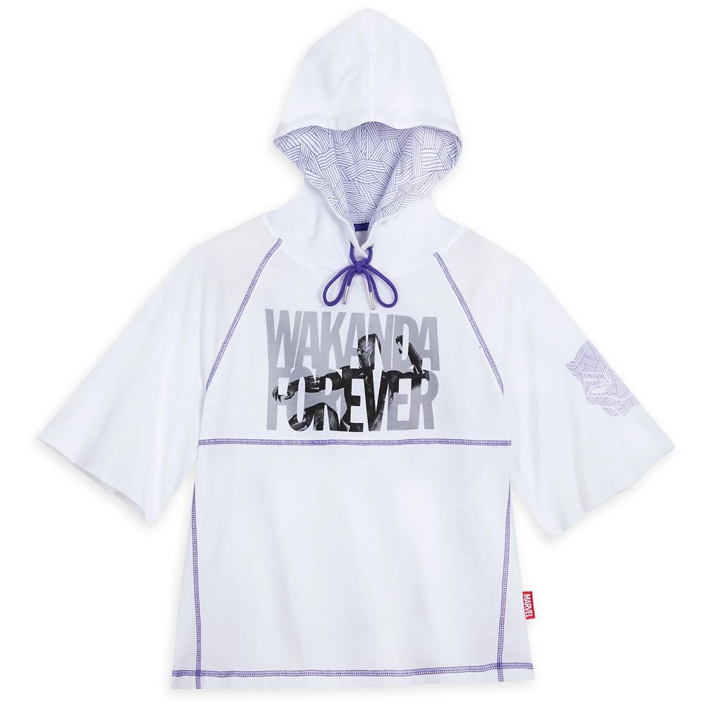 A dynamic image of the Black Panther is visible in the lettering of the ”Wakanda Forever” slogan on the front of this pullover hoodie. Short sleeves, a hood lined with an allover geometric design, and contrasting stitching make this a fashion marvel.