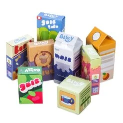 - Features eight boxes of play food including tea, milk, flour, apple juice, orange juice, dog treats, popsicles, and cereal