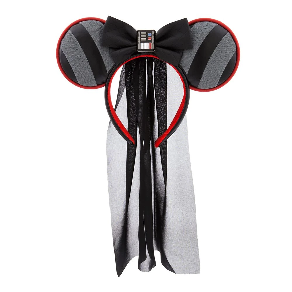 Let the power go to your head with this Darth Vader ear headband. Fashioned in black and gray stripes with red trim and interior, it has a black veil down the back that calls to mind his signature cape. Topping it off is a black bow accented with a charm depicting the Lord Vader’s chest plate.ย