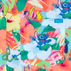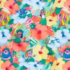- Allover Hawaiian floral pattern featuring Lilo, Stitch, Nani, David, Mertle, Jumba Jookiba, and Pleakely