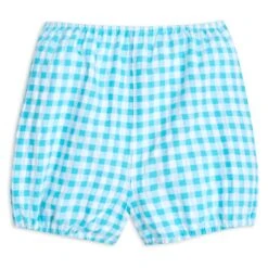 - Three-piece gingham seersucker set includes dress, bloomers and headband