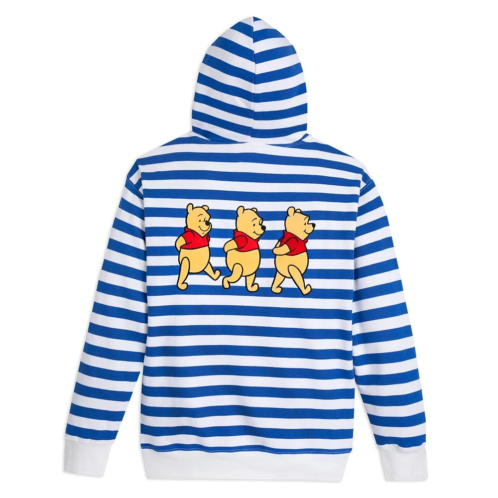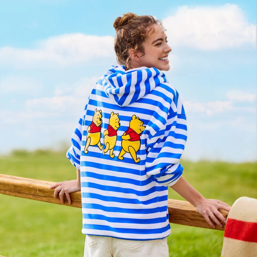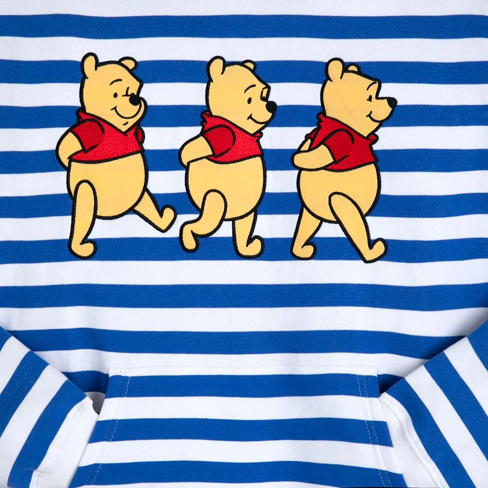 Blustery days are no bother with Winnie the Pooh and this striped pullover hoodie featuring embroidered Pooh appliquΓ©s on the front and back,Β a warm fleece interior, contrast ribbed trims and a pouch pocket. It’s just the thing to wear every ”windsday” or any day.Β Β